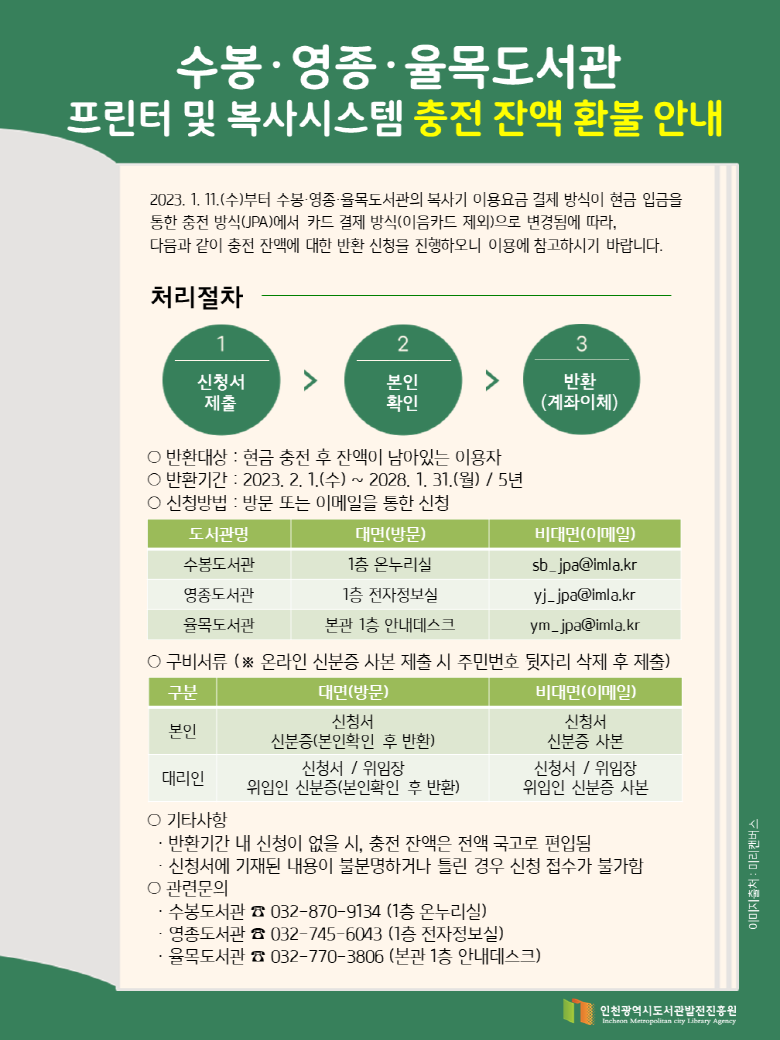 ** 2023. 1. 11.(수)부터 수봉·영종·율목도서관의 복사기 이용요금 결제방식이 현금 입금을 통한 충전 방식(JPA)에서 카드 결제 방식(이음카드 제외)으로 변경됨에 따라, 다음과 같이 충전 잔액에 대한 반환 신청을 진행하오니 이용에 참고하시기 바랍니다. **○ 대상기관 : 수봉·영종·율목도서관○ 처리절차 : 1.신청서 제출 → 2.본인확인 → 3.반환(계좌이체)○ 반환대상 : 현금 충전 후 잔액이 남아 있는 이용자○ 반환기간 : 2023. 2. 1.(수) ~ 2028. 1. 31.(월) / 5년○ 신청방법 : 방문 또는 이메일을 통한 신청- 수봉도서관 : [대면]1층 온누리실 [이메일] sb_jpa@imla.kr- 영종도서관 : [대면]1층 전자정보실 [이메일] yj_jpa@imla.kr- 율목도서관 : [대면]본관 1층 안내데스크 [이메일] ym_jpa@imla.kr○ 구비서류- [대면] 신청서 및 신분증 (대리인의 경우 신청서, 위임장, 위임인 신분증)- [이메일] 신청서 및 신분증 사본(주민번호 뒷자리 삭제 후 제출) / 대리인의 경우 신청서, 위임장, 위임인 신분증 사본(주민번호 뒷자리 삭제 후 제출)○ 기타사항- 반환기간 내 신청이 없을 시, 충전 잔액은 전액 국고로 편입됨- 신청서에 기재된 내용이 불분명하거나 틀린 경우 신청 접수가 불가함○ 관련문의- 수봉도서관 032-870-9134 (1층 온누리실)- 영종도서관 032-745-6043 (1층 전자정보실)- 율목도서관 032-770-3806 (본관 1층 안내데스크)