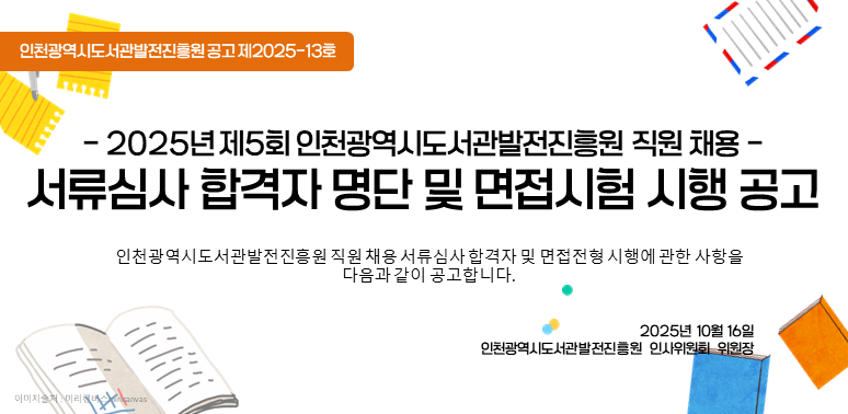 공고ㅣ2025년 제5회 인천광역시도서관발전진흥원 직원 채용 서류심사 합격자 명단 및 면접시험 시행 공고