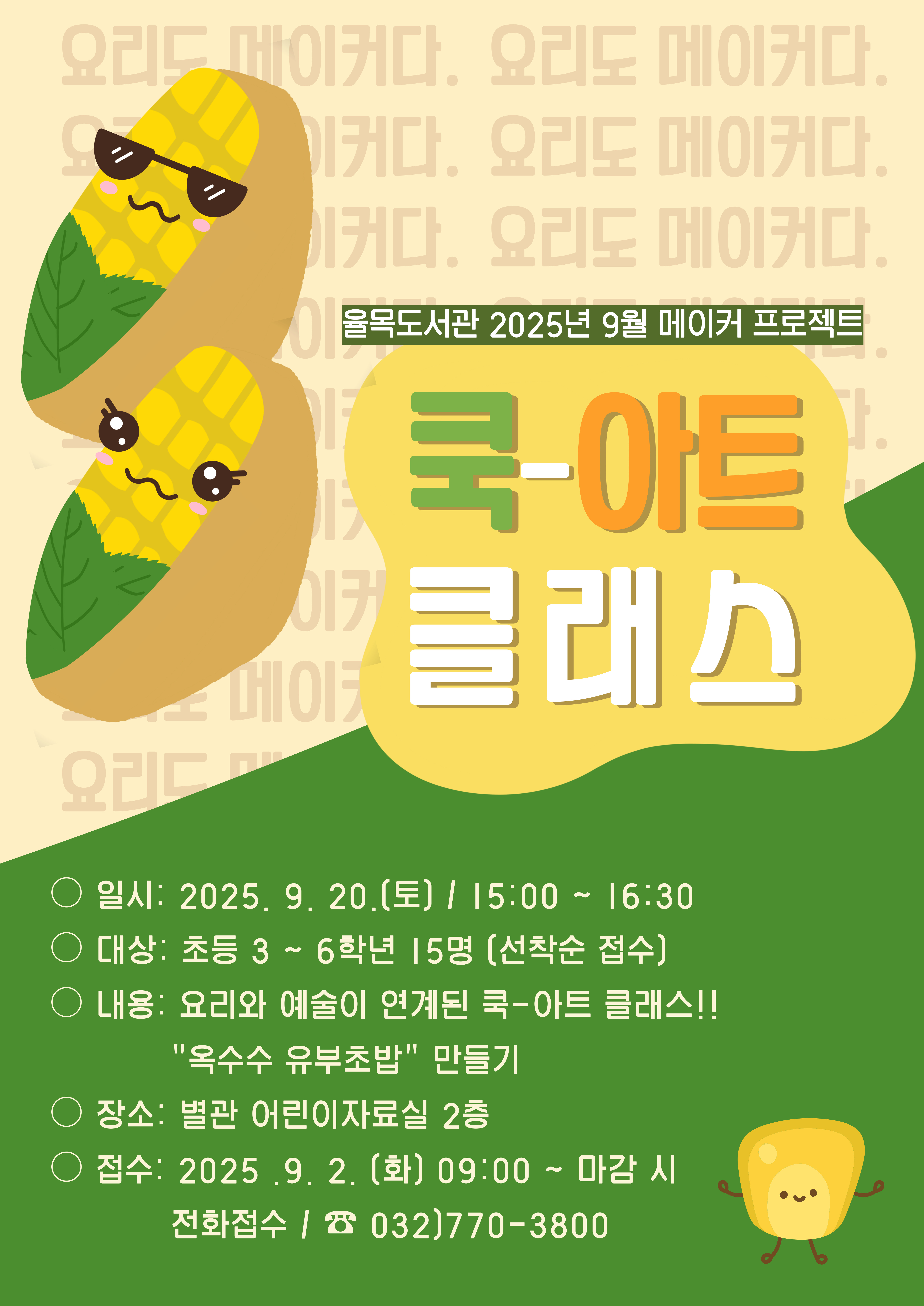 - 일시 : 9월 20일 토요일 15:00~16:30- 대상 : 초등 3~6학년 15명- 장소 :별관 어린이자료실 2층- 접수 : 9. 2.(화) 09:00 ~ 전화접수 (032)770-3800)