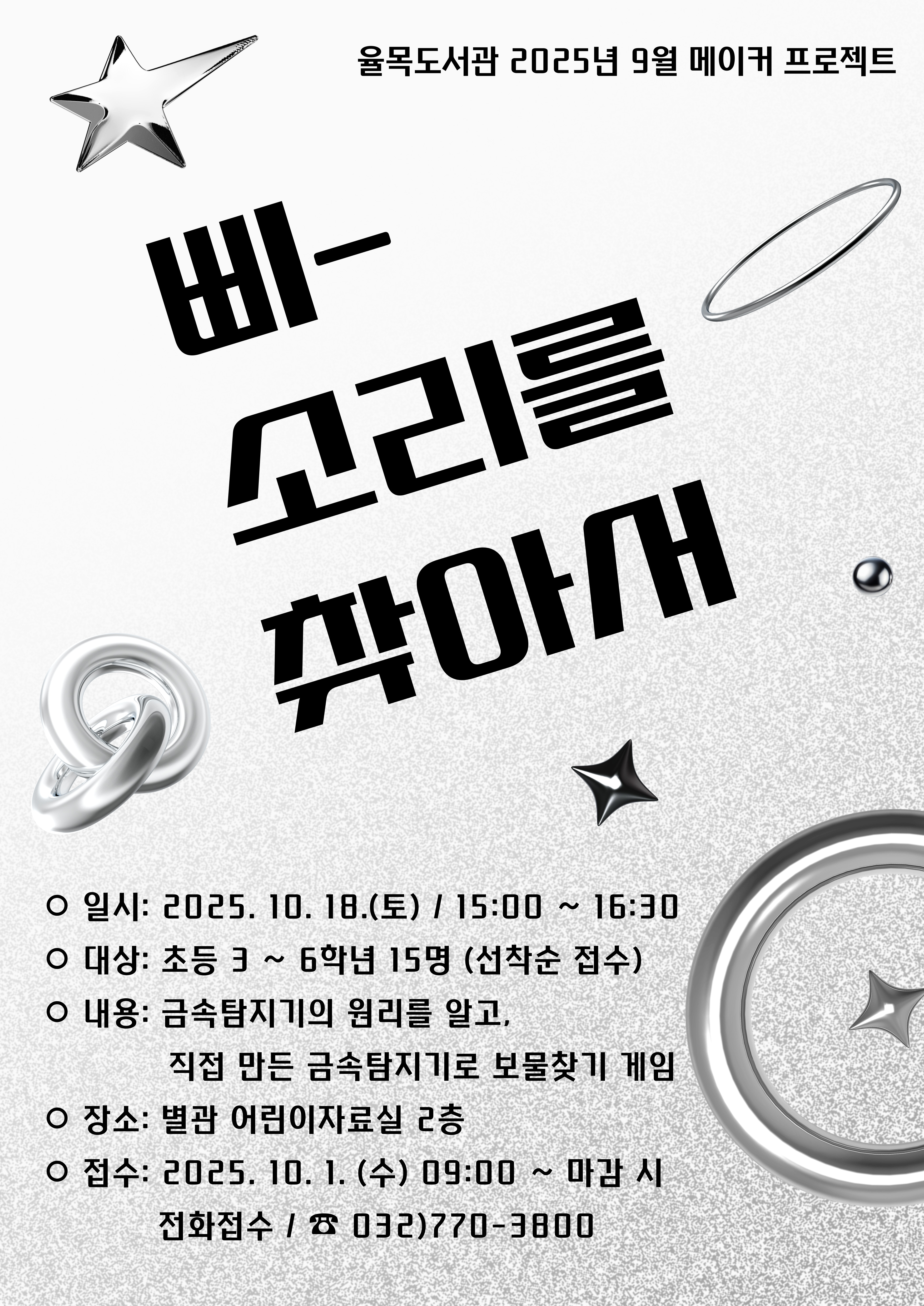 - 일시 : 10월 18일 토요일 15:00~16:30- 대상 : 초등 3~6학년 15명- 장소 :별관 어린이자료실 2층- 접수 : 10. 1.(수) 09:00 ~ 전화접수 (032)770-3800)